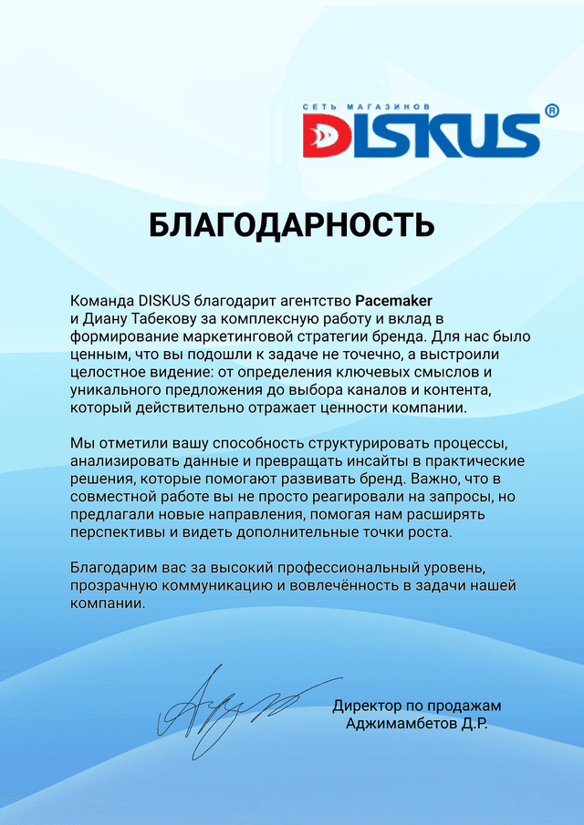 Компания Дискус очень благодарна агентству Pacemaker, которое использовав свой опыт со спортивными продуктами, смогло по- новому посмотреть на наши бренды и предложить маркетинговые пути решения наших проблем. Здесь особенно хотим выглядеть рекламу через Яндекс директ и ВК, так как к нам пришла новая более молодая аудитория, а команда Расеmaker взяла на себя всю работу по продвижению и тексты, и баннеры для рекламы. Спасибо Pacemaker, желаем дальнейшего процветания!